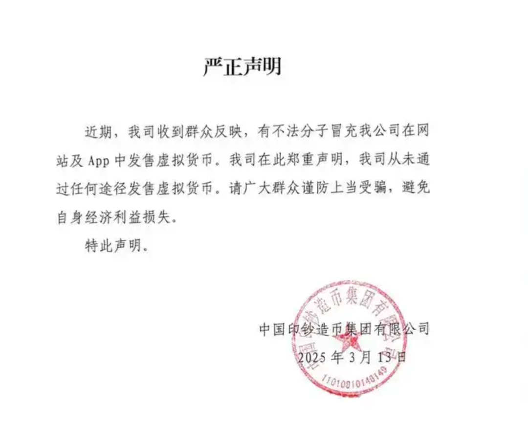 中国印钞造币集团3月13日发布声明:近期,我司收到群众反映,有不法分子冒充我公司在网站及App中发售虚拟货币。我司在此郑重声明,我司从未通过任何途径发售虚拟货币。请广大群众谨防上当受骗,避免自身经济利益损失。