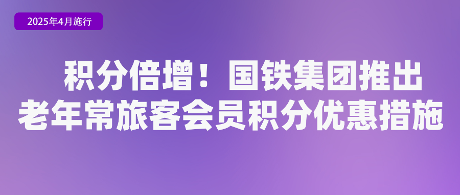 4月1日起,国铁集团在现行“铁路畅行”常旅客会员服务基础上,对年满60周岁持居民身份证、港澳居民居住证、台湾居民居住证、港澳居民来往内地通行证、台湾居民来往大陆通行证、外国人永久居留身份证的老年常旅客会员实施更大幅度的积分优惠,积分可兑换火车票,将更好地满足老年旅客对美好旅行生活的向往,为促进银发经济发展、扩大服务消费注入新动能。