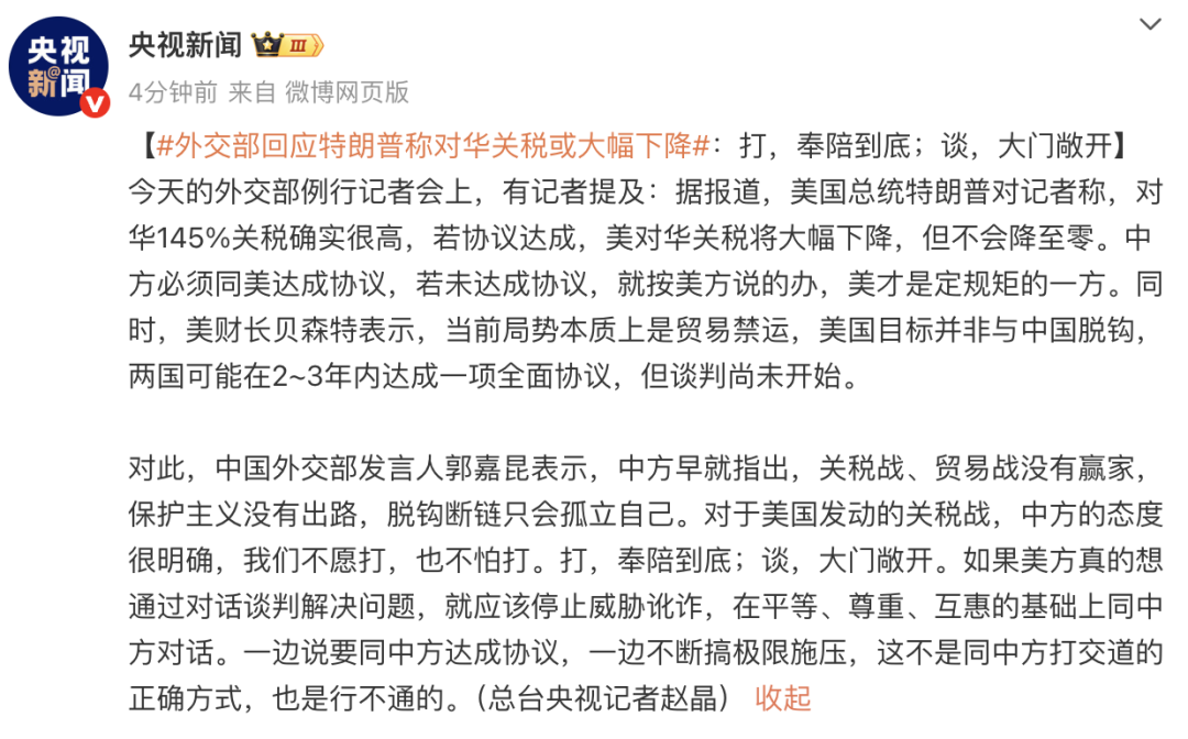 外交部回应特朗普称对华关税或大幅下降。