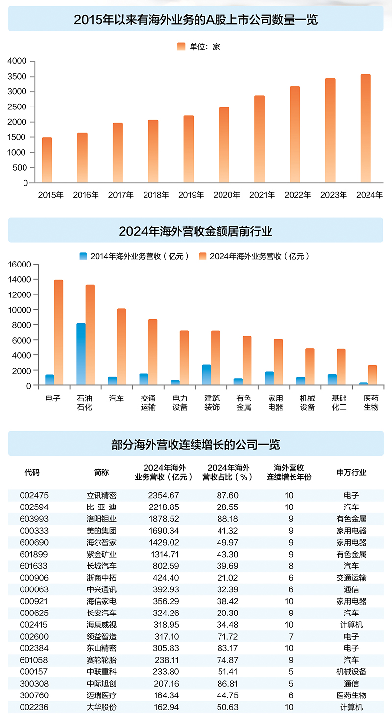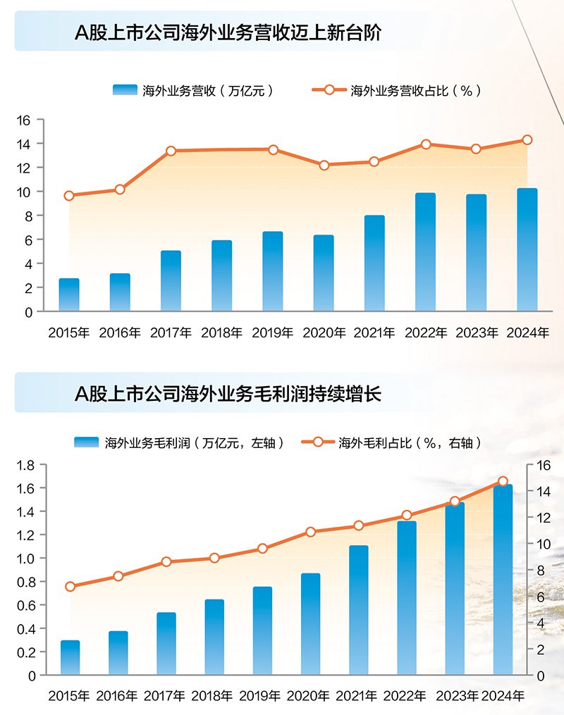 据证券时报·数据宝统计,2024年有海外业务的A股上市公司数量超过3560家,数量占比达到66.37%,两项数据均创历史新高。越来越多的上市公司积极融入全球市场,海外业务成为推动业绩增长的重要引擎。2024年A股公司海外业务营收突破10万亿元,相比十年前增长2.8倍;2024年A股公司海外业务占总营收的比例达到14.28%,创历史新高,与十年前相比,占比提升4.65个百分点。不仅如此,上市公司出海业务毛利润也呈现大幅增长趋势,2024年海外业务毛利润达到1.63万亿元,相比十年前增长8.33倍;海外业务毛利润占总体毛利润的比例达到14.71%,相比十年前提升8个百分点,这是海外业务毛利占比首次超过海外营收占比。