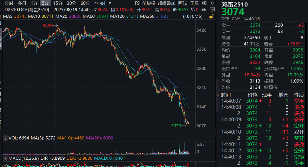 8月19日,国内期货市场鸡蛋主力合约2510价格继续下挫,盘中最低报3070元/500千克,为2016年10月以来低点。