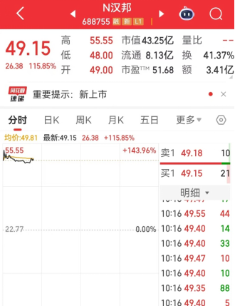 N汉邦开盘价49元,开盘上涨115.2%。公司是一家以色谱技术为核心,集研发、生产和销售于一体的高新技术企业,主要为制药、生命科学等领域提供专业的分离纯化装备、耗材、应用技术服务及相关的技术解决方案。
