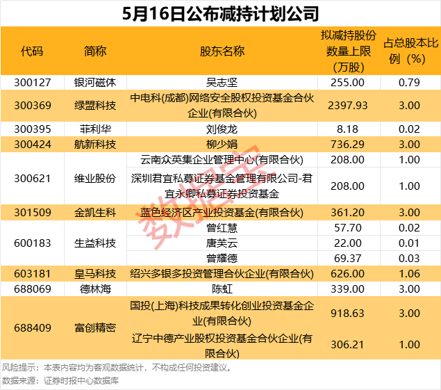 5月16日,共10家公司公告股东减持计划,拟减持比例居前的有富创精密、绿盟科技、航新科技、德林海等。