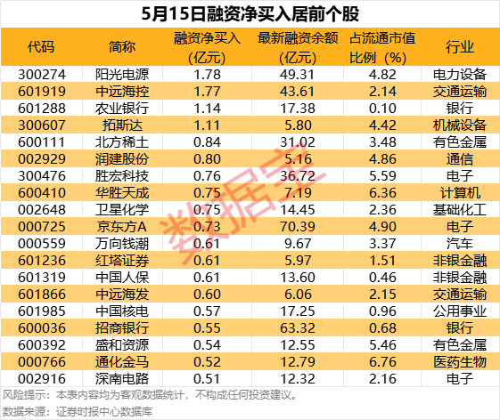 具体到个股,5月15日获融资净买入千万元以上的有287股,其中19股融资净买入额超5000万元。阳光电源融资净买入额居首,当日净买入1.78亿元;其次是中远海控、农业银行,融资净买入金额分别为1.77亿元、1.14亿元;融资净买入金额居前的还有拓斯达、北方稀土、润建股份等。