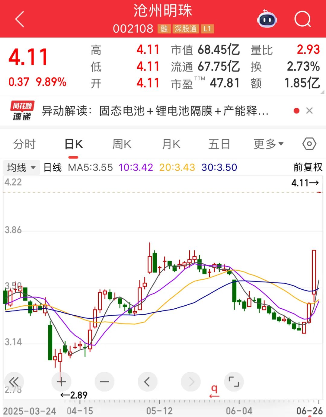 固态电池领域中的稀缺题材——锂电隔膜概念,表现更为亮眼。其中,沧州明珠开盘涨停,封单超过105万手。此外,佛塑科技开盘后快速涨停,星源材质一度飙升近20%。