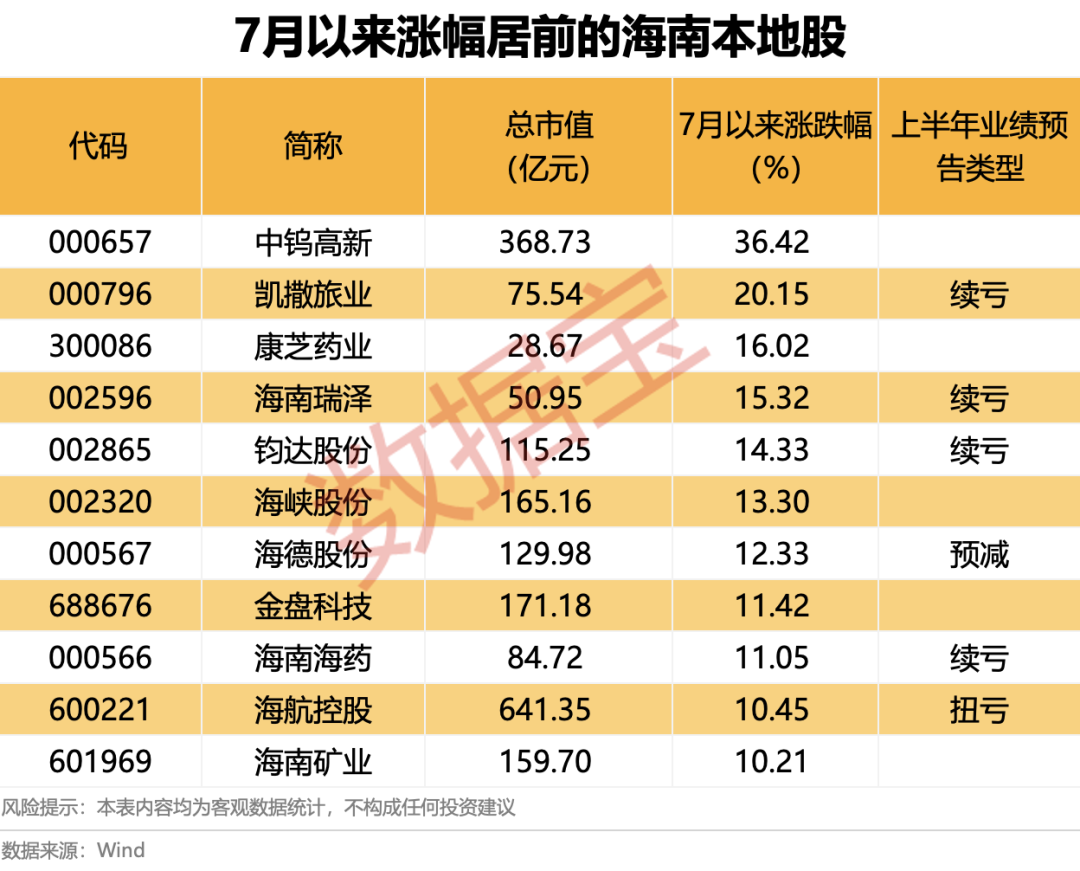 7月以来,海南本地股的股价几乎全线录得上涨,中钨高新、凯撒旅业、康芝药业、海南瑞泽等股价涨幅居前。