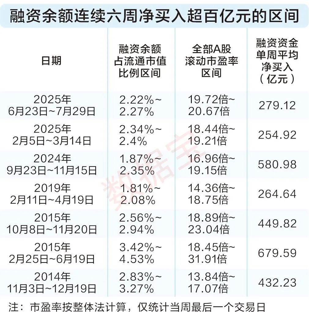 本轮融资余额持续增长始于6月23日,截至最新,融资资金已连续六周净买入超百亿元,累计金额达到1674.73亿元。历史行情显示,融资资金连续六周及以上净买入的情况共出现过七次,其中前三次发生在2014年和2015年,后三次则集中在2024年“9·24”行情后。