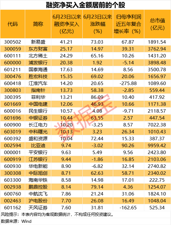 据数据宝统计,6月23日以来,融资资金净买入居前的个股集中于算力、半导体、新能源汽车等科技赛道,共有56股累计净买入超5亿元,如CPO龙头新易盛净买入41.21亿元,居于榜首,中科曙光、中际旭创亦上榜;半导体概念菲利华、澜起科技、寒武纪-U等个股上榜;新能源汽车概念股比亚迪、宁德时代、国轩高科等也上榜。
