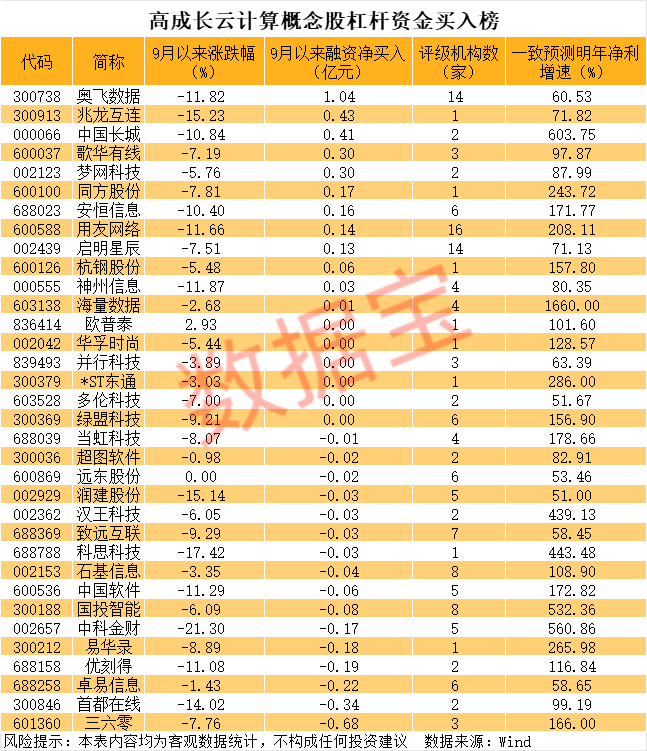 根据机构一致预测,有34只概念股明年净利增速超50%,海量数据、中国长城、中科金财等个股均有望翻倍增长。从杠杆资金净买入情况来看,奥飞数据、兆龙互连、中国长城等个股9月以来融资净买入均超千万元。