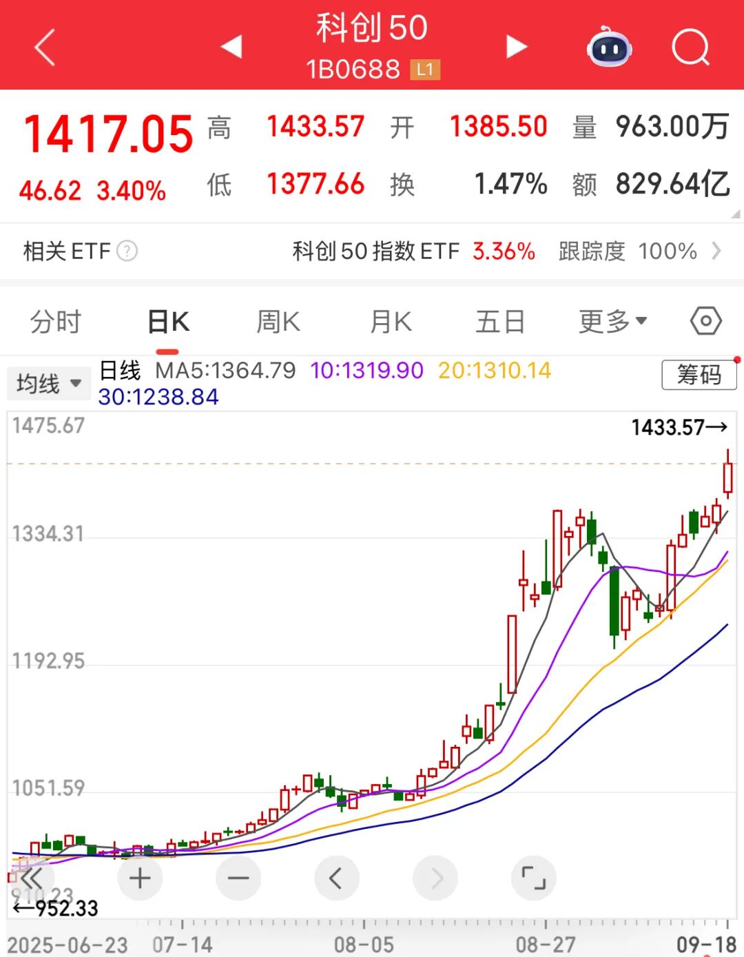 今日(9月18日)科技股继续飙升,科创50指数站上1400点大关,再创阶段新高。板块方面,CPO、半导体设备、光芯片等题材涨幅居前。