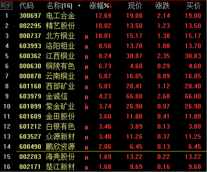 盘面上,电工合金开盘上涨12.69%,洛阳钼业上涨8.56%,江西铜业上涨8.24%;大幅上涨的还有铜陵有色、云南铜业、西部矿业、金诚信等。