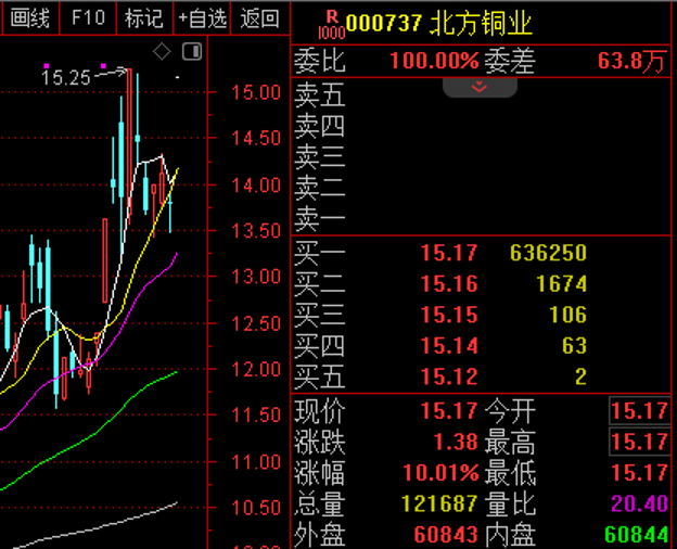 9月25日早盘,有色铜板块开盘大涨。精艺股份开盘“一”字涨停,涨停板封单一度超20万手。北方铜业(000737)开盘涨停,涨停板封单一度超60万手,随后涨停板被打开,涨幅回落至7%左右。