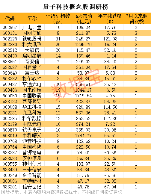 据证券时报·数据宝统计,A股市场量子科技概念股合计有80多只。其中,中兴通讯、国电南瑞、中科曙光、中国联通、科大讯飞等A股市值均超千亿元。从机构关注度来看,中兴通讯、国电南瑞、中科曙光、中国联通、科大讯飞等个股均有20家以上机构评级。