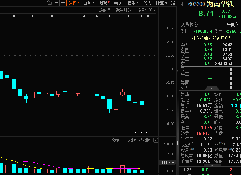 此前因为算力大单,海南华铁股价出现了大涨,而今终止协议对股价也产生了较大的负面影响。今天早盘海南华铁开盘跌停,整个上午保持在一字跌停状态,收盘下跌10.02%,封单近300万手。