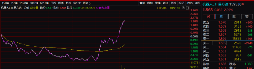 9月2日午后,浙江荣泰突然直线封板。与此同时,机器人板块大举反攻,舜宇精工大涨30%,春兴精工、博杰股份、拓普集团等集体涨停,涨停及涨幅超过10%的个股达到了16只以上。机器人ETF亦于午后快速拉升,并大幅翻红。