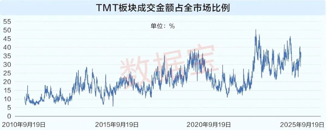 交易拥挤度也是衡量市场流动性以及风险的重要指标。2025年以来,TMT板块累计成交额接近95万亿元,创历史新高,较2024年全年增长近20%。