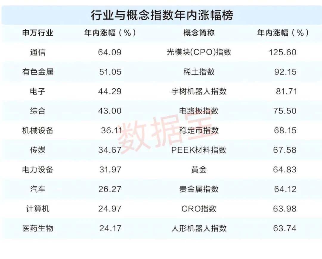 科技题材更是井喷式上涨,光模块指数年内大涨超125%,电路板、PEEK材料、CRO、人形机器人等10多个概念指数涨逾50%。
