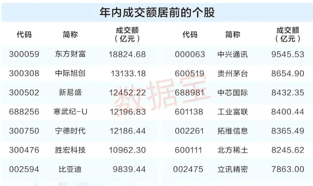 TMT板块的加权换手率更高,年内峰值一度接近5.8%,超过此前两轮牛市的峰值。这种交易集中度在个股层面更为明显,年内累计成交额前20名有多达12只是TMT板块个股,中际旭创、新易盛、寒武纪-U等累计成交额均超万亿元;如果再加上宁德时代、比亚迪等科技类公司,科技股的“头部效应”会更加凸显。