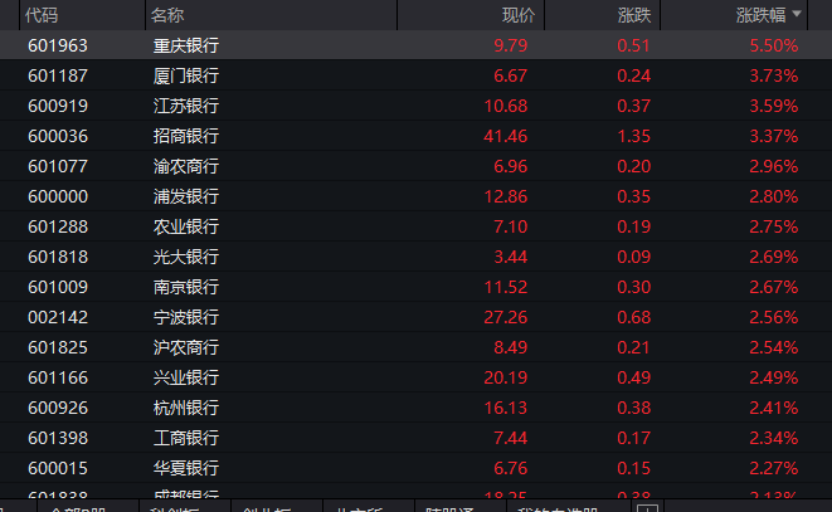 行业板块和赛道方面,大金融走强,其中银行板块涨幅超过2%,重庆银行、厦门银行、江苏银行、招商银行涨幅超过3%。渝农商行、浦发银行、农业银行等10多只银行股涨幅均超过2%。