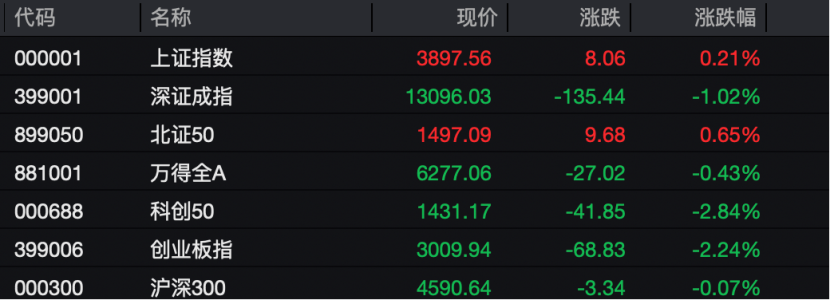 截至午间收盘,上证指数涨0.21%,报3897.56点,深证成指跌1.02%,报13096.03点,创业板指跌2.24%,科创50指数跌2.84%;北证50涨0.65%。