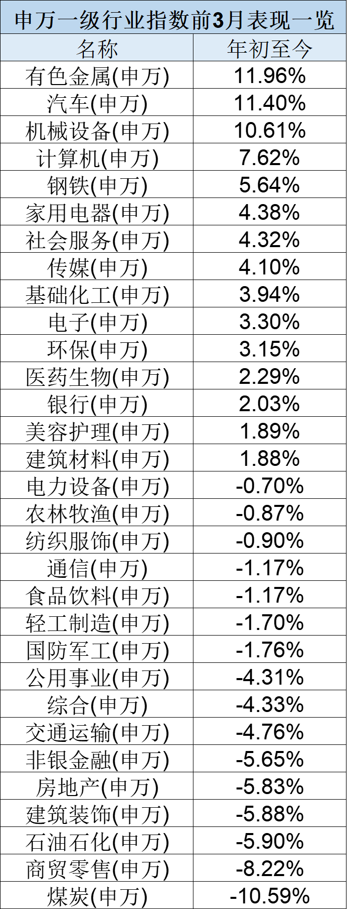 从申万一级行业表现来看,有色金属成为前3月表现最好行业,涨幅达到11.96%,汽车、机械设备等涨幅也超10%。而煤炭、商贸零售、石油石化、建筑装饰、房地产、非银金融等板块跌幅超过5%。