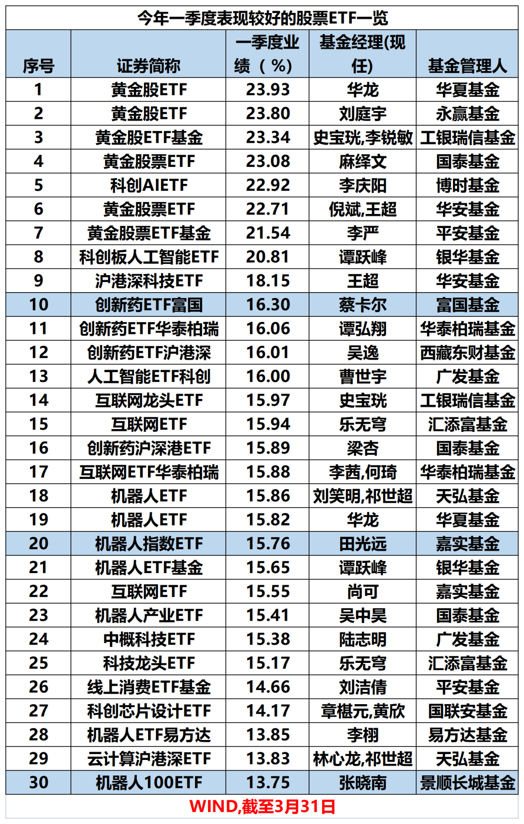一季度,科技板块异军突起,跟踪人形机器人的指数基金也表现神勇。从具体指数基金表现来看,前3月收益前10的股票ETF中,和黄金、人工智能相关的产品“霸榜”。其中,华夏黄金股ETF今年一季度业绩近24%,位居前3月股票ETF业绩第一。紧随其后的是永赢、工银瑞信、国泰旗下黄金股ETF,今年前3月净值增长率也均超23%。