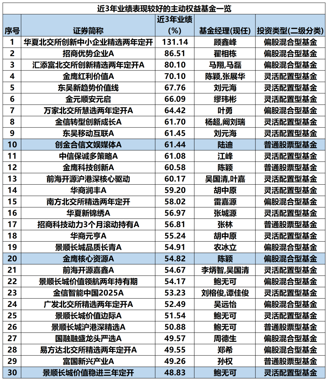 东吴新趋势价值线、金元顺安元启、万家北交所慧选两年定开A、金信转型创新成长A、东吴移动互联A等近三年净值增长率均在60%以上。