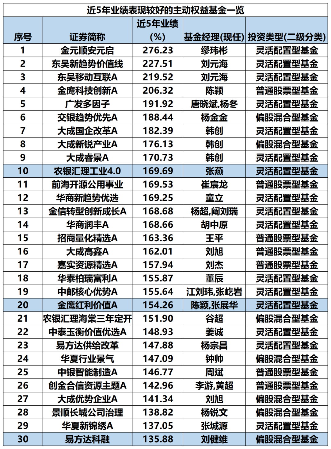 广发多因子、交银趋势优先A、大成国企改革A、大成新锐产业A、大成睿景A等也表现较好,近五年业绩均在170%以上。