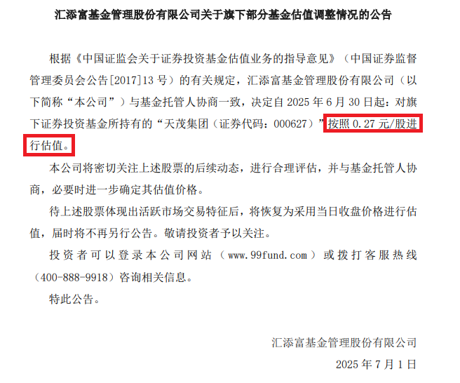 7月1日,汇添富基金发布关于旗下部分基金估值调整情况的公告,公告中称,根据《中国证监会关于证券投资基金估值业务的指导意见》(中国证券监督管理委员会公告〔2017〕13号)的有关规定,汇添富基金与基金托管人协商一致,决定自2025年6月30日起:对旗下证券投资基金所持有的“天茂集团(证券代码:000627)”按照0.27元/股进行估值。