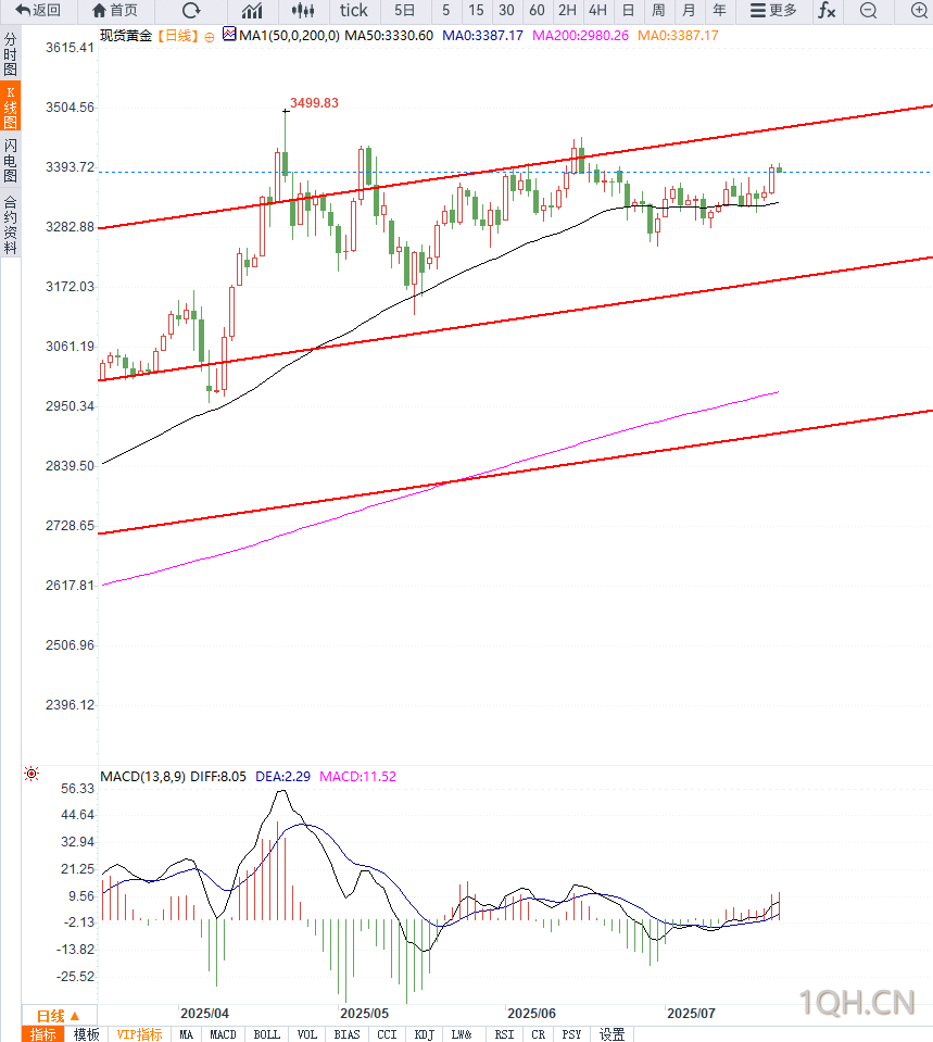 短期阻力位于3452美元(三个月高点),若突破该水平,有望进一步上探历史高点3500美元,甚至通道上轨3630美元。