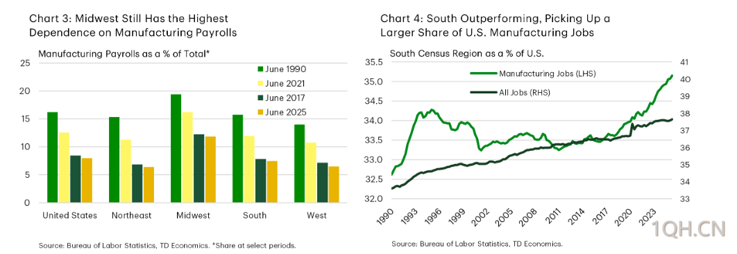 中西部地区仍在制造业就业中占据较大比重,但该份额已逐年缩减(Chart3)。制造业就业集中度最高的州包括:印第安纳州(占总就业16%)、威斯康星州(15%)、爱荷华州(14%)和密歇根州(13%)。相比之下,南部各州在制造业就业需求中的存在感显著增强——过去三年间,路易斯安那州、佛罗里达州和得克萨斯州增长最为迅猛,使该地区在全国制造业就业版图中的份额持续扩大(Chart4)。