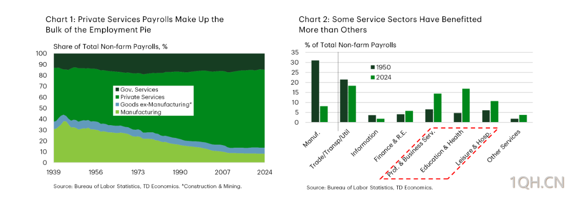 制造业就业占比在二战末期达到38%的峰值,而过去十年已降至约8%(Chart1)。服务业填补了这一空缺,其就业份额相应增长29个百分点,目前占总就业人口的86%以上。高增长领域包括医疗保健、教育服务、专业及商业服务,以及休闲接待业(Chart2)。聚焦近年数据,这些行业在后金融危机时期展现出最强劲的就业增长势头。