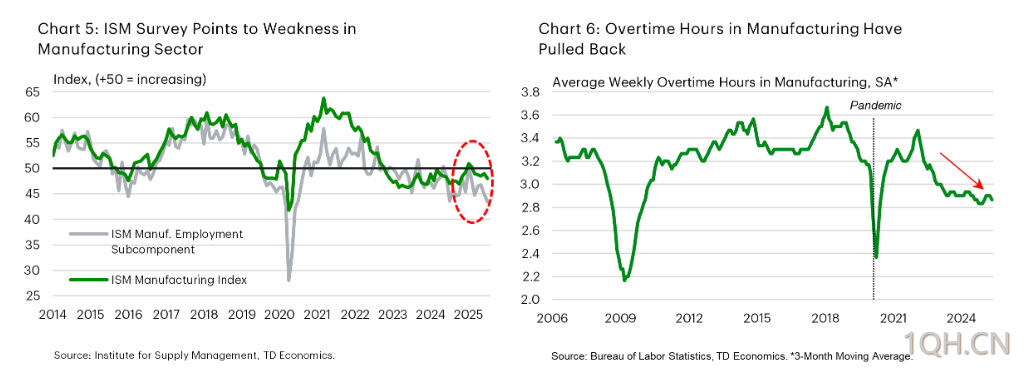 过去数月制造业就业持续走低,同比下滑0.9%(减少11.3万个岗位),其中约三分之二的岗位流失集中在运输设备、计算机及电子产品制造领域。ISM制造业调查同样印证疲软态势——整体指数及就业分项指数已连续多月处于收缩区间(Chart5)。此外,该行业加班工时亦低于历史平均水平(Chart6)。综合各项指标显示,制造业仍处疲软状态,近期全球增长放缓与贸易不确定性高企的双重压力难辞其咎。