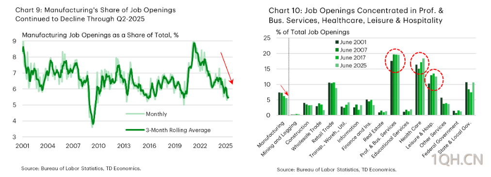 其他经济领域中,职位空缺仍集中在专业及商业服务、医疗保健、休闲接待业等传统强势行业——这些行业多年来始终保持着就业增长优势(Chart10)。零售贸易及州/地方政府等部门的职位空缺也占据相当比重。