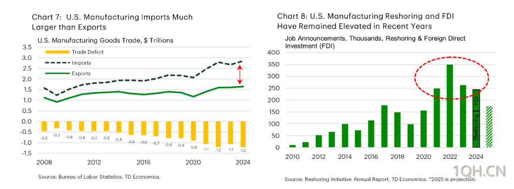 尽管保护主义贸易政策常伴随诸多弊端——包括推高产品价格、抑制整体贸易规模及引发报复性措施等,但关税手段确实可能在特定时期内提振美国制造业。关键原因在于美国长期面临巨额贸易逆差:其制成品占出口总额近80%,而进口占比更高达87%。如Chart7所示,当关税政策刺激本土生产时,这种高度依赖进口的贸易结构反而可能产生效益。即便遭遇他国报复性关税冲击出口及相关配套产业,仍可能促使部分进口商品转为本土生产,初期往往通过提升现有产能利用率实现。