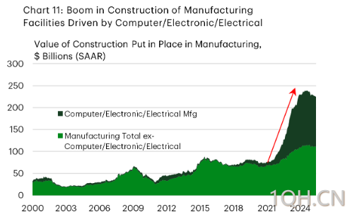 这波制造业建设热潮预示着行业中长期的向好前景。尽管过去几个季度的建设投资主要集中在“计算机、电子和电气”领域(如半导体工厂),但其他制造业领域的投资同样呈现升势(Chart11)。随着新建设施陆续投产,行业产出和就业都将获得提升空间。如前所述,保护主义贸易政策也可能成为助力。部分制造业领域将更具发展优势,包括战略与国家安全相关产品(如半导体、无人机、武器等)以及高附加值产品(如电动汽车、电池等)的生产商。