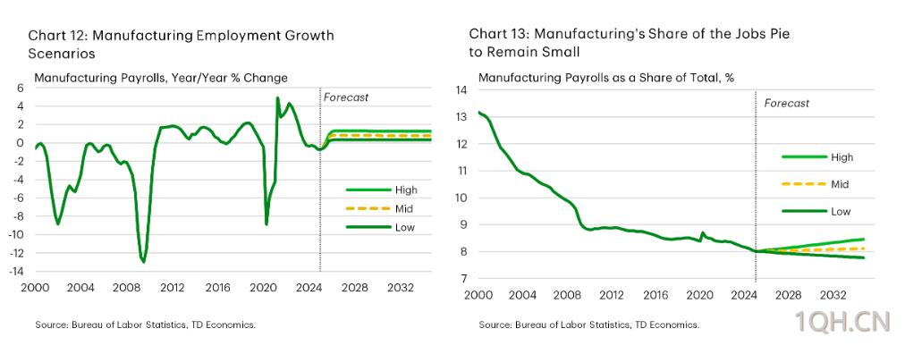 鉴于关税政策尚未最终定型,且制造业正处于关键转折点,未来十年该行业就业增速难以准确预估。为此我们设想了三种情景:低速增长(基本延续近年趋势)、中速增长(制造业就业增速与整体就业市场持平)以及高速增长(在乐观前景与充足劳动力供给的双重作用下,制造业就业增速达到整体预期的两倍)(Chart12)。这三种情景下,制造业就业将分别增加约40万、100万和170万个岗位。如图表13所示,在低速增长情景中,制造业就业占比将持续缓降;中速增长下将维持当前比例;而高速增长情景则有望在十年内从约8%温和提升至8.5%。