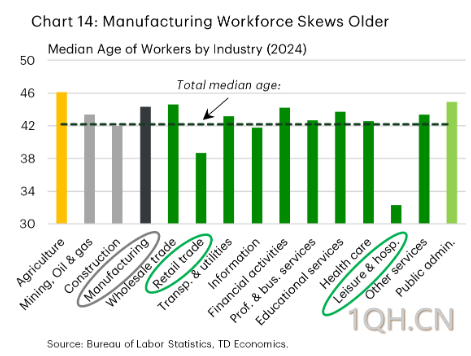 Chart14显示了精选行业的中位年龄数据。制造业劳动力年龄结构明显高于全行业平均水平,而零售贸易和休闲接待业则年轻得多。前文情景分析中的就业“净增长”仅是未来制造业用工挑战的冰山一角——制造业工人平均年龄较整体劳动力年长数岁,且超过25%的从业人员年龄在55岁以上(Chart14)。某些细分领域老龄化更严重:例如金属加工和纺织厂中约40%工人超过55岁。这种年龄结构意味着制造商需投入大量资源填补退休空缺,而休闲接待业和零售业等年轻化行业则无此压力。