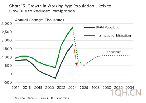 这一困境也折射出美国更广泛的社会现实。我们的基准预测显示,在人口老龄化、移民政策收紧及劳动参与率停滞的背景下(Chart15),到2034年美国劳动力总量仅将增长约700万人。这意味着制造业需要与其他行业激烈争夺有限的劳动力资源。
