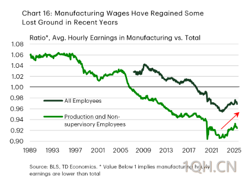 Chart16显示了两组人群的制造业平均时薪与全行业水平的比值:全体雇员,以及生产与非主管雇员。两组比值均低于1,表明制造业时薪在两类比较中均处劣势。但值得注意的是,过去几个季度该比值持续攀升,意味着制造业薪资正逐步缩小差距。
