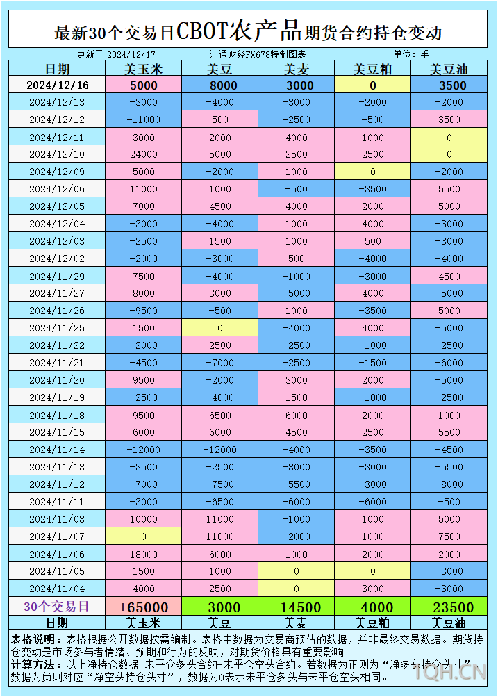 增加CBOT玉米投机性净多头;增加CBOT大豆投机性净空头;增加CBOT小麦投机性净空头;增加CBOT豆粕投机性净多头;增加CBOT豆油投机性净空头;