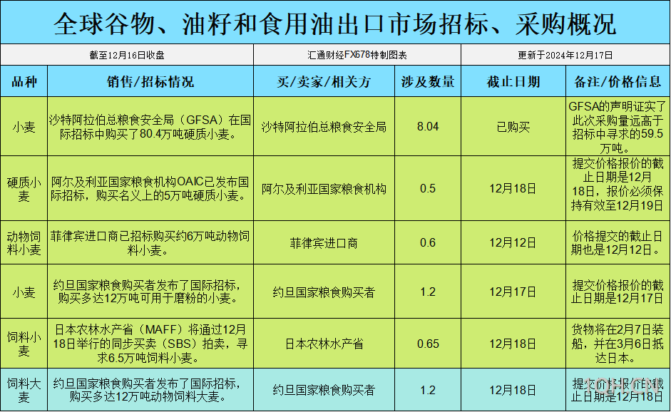 全球谷物、油籽和食用油出口市场招标、采购概况: