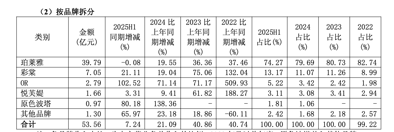 一个趋势是,彩棠品牌的营收占比正持续提升,从2022年的8.99%提升至2024年的11.07%,并进一步提升至2025年上半年的13.17%。